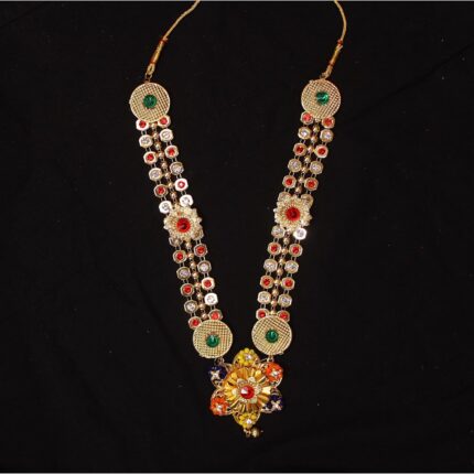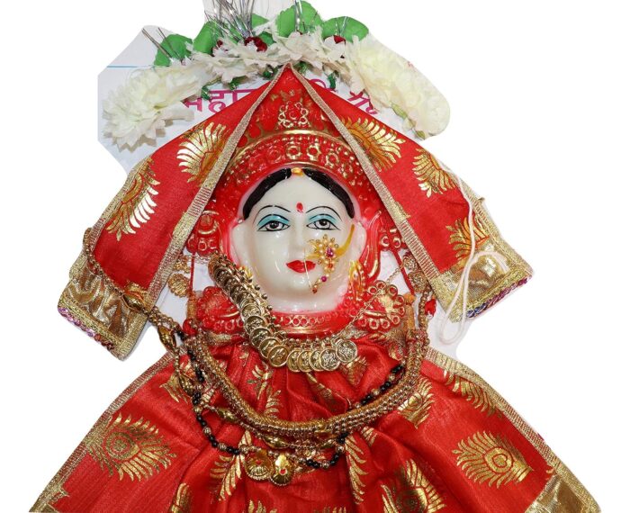 - Package Contents – This face set Contains , one mataji mukhota , lehengha phatka for mataji size – 7 inches , jhumkha , nath , laxkshmi har , putli har , thushi ,Veni