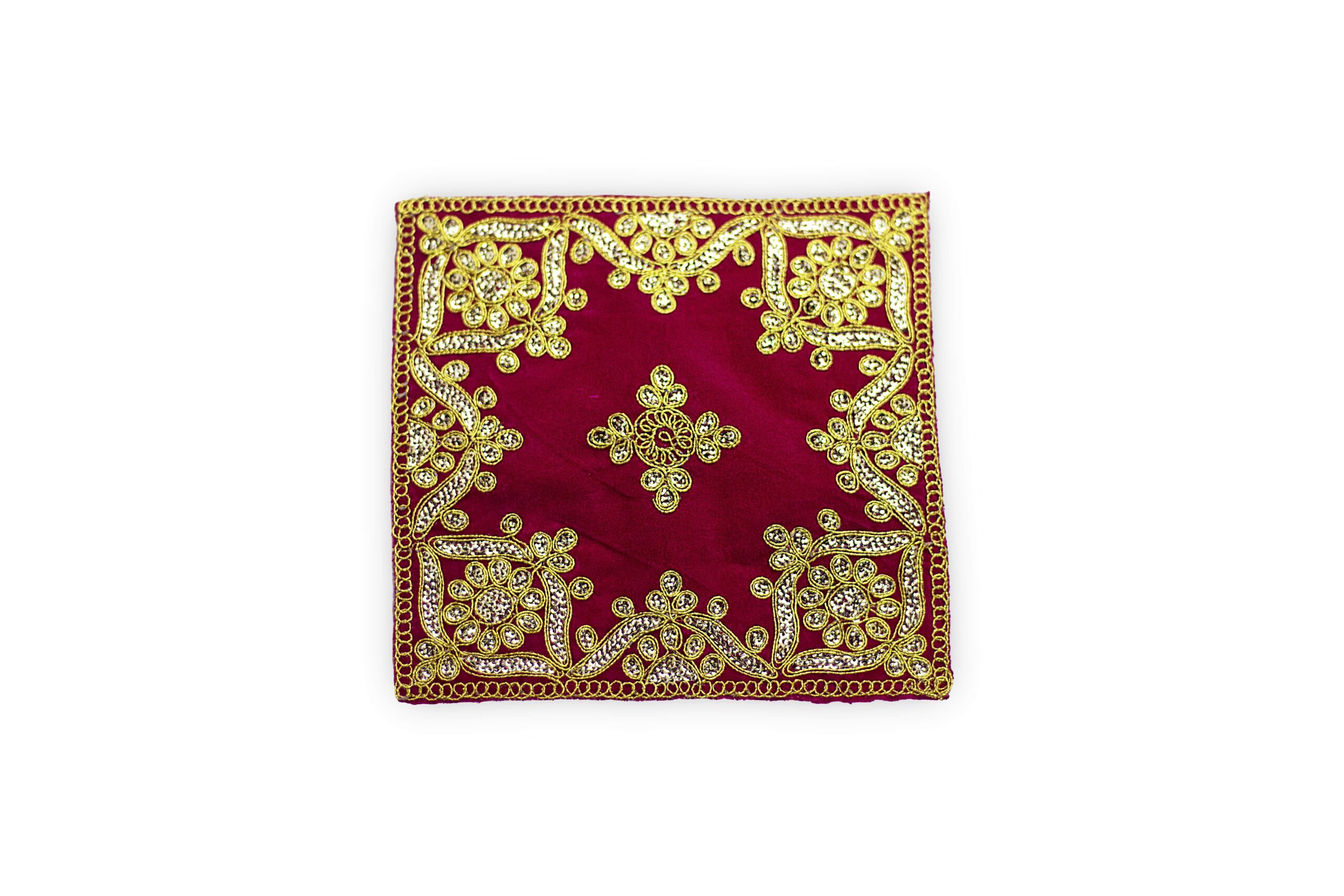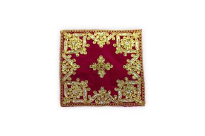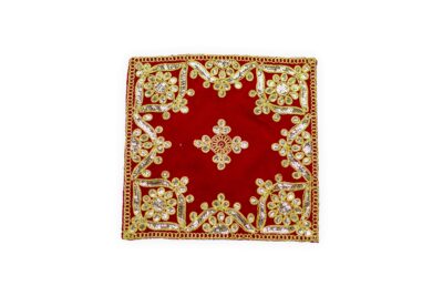 - Velvet Puja Aasan Cloth comes with a beautiful embroidered design surrounding it along all corners.To enhance the look of this puja velvet cloth , the elegant design combination of the cloth gives this Red chowki aasan a very lustrous royal feel.